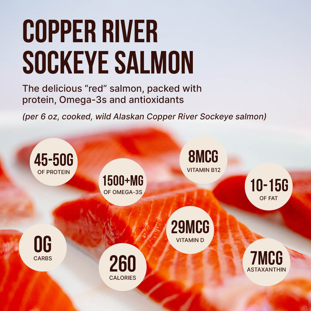 Copper River sockeye salmon is one of the most sought-after salmon in the world. It's known for its bright red color, bold flavor, and high levels of various nutrients, especially Omega-3s fatty acids that are a powerhouse for your heart and brain. It's also rich in proteins, vitamins, and a powerful antioxidant astaxanthin.
